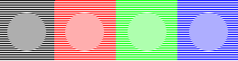 On a gamma-adjusted display, the four circles in the color image blend into the background when seen from a few feet away. If they do not, you could adjust the gamma setting (found in the computer's settings, not on the display), until they do. This may be very difficult to attain, and a slight error is not detrimental. Uncorrected PC displays usually show the circles darker than the background.